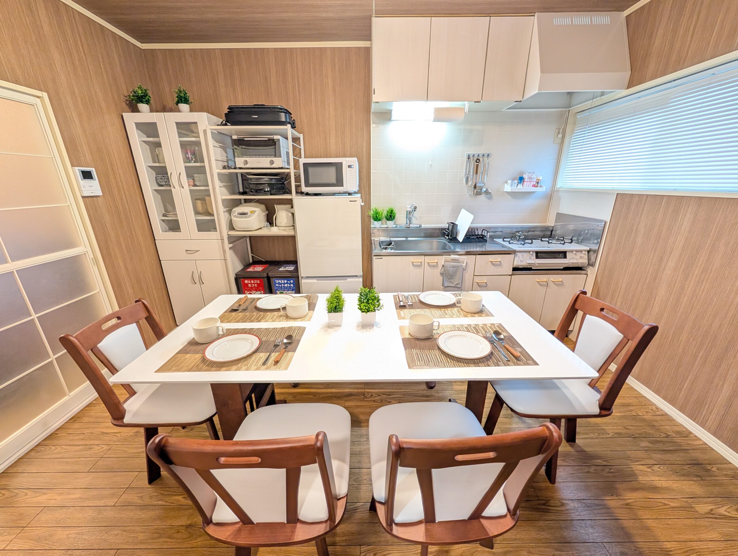 - 設備: WIFI、 全室エアコン、冷蔵庫、洗濯乾燥機、電子レンジ、水洗トイレ(ウォシュレット)、炊飯器 、電気ケトル 、ヘアドライヤー 、ホットプレート 、オーブン 、フライパン 、電気グリル鍋 、食器類 、掃除機